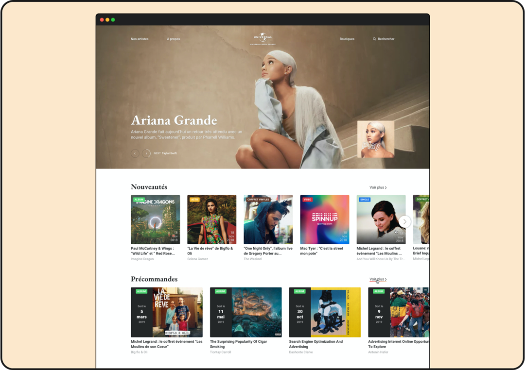 Durant mon périple en dehors des frontières française, une opportunité c’est présentée à moi, travailler à Universal Music France. J’ai actuellement la chance de travailler sur une multitude de projets divers, tel que la création d’un Design System, le site universalmusic.fr, créer des outils interne pour faire gagner en confort et en productivité les équipes d’Universal, travailler sur une application, ou même, la création de template emailing pour les différents labels de music.